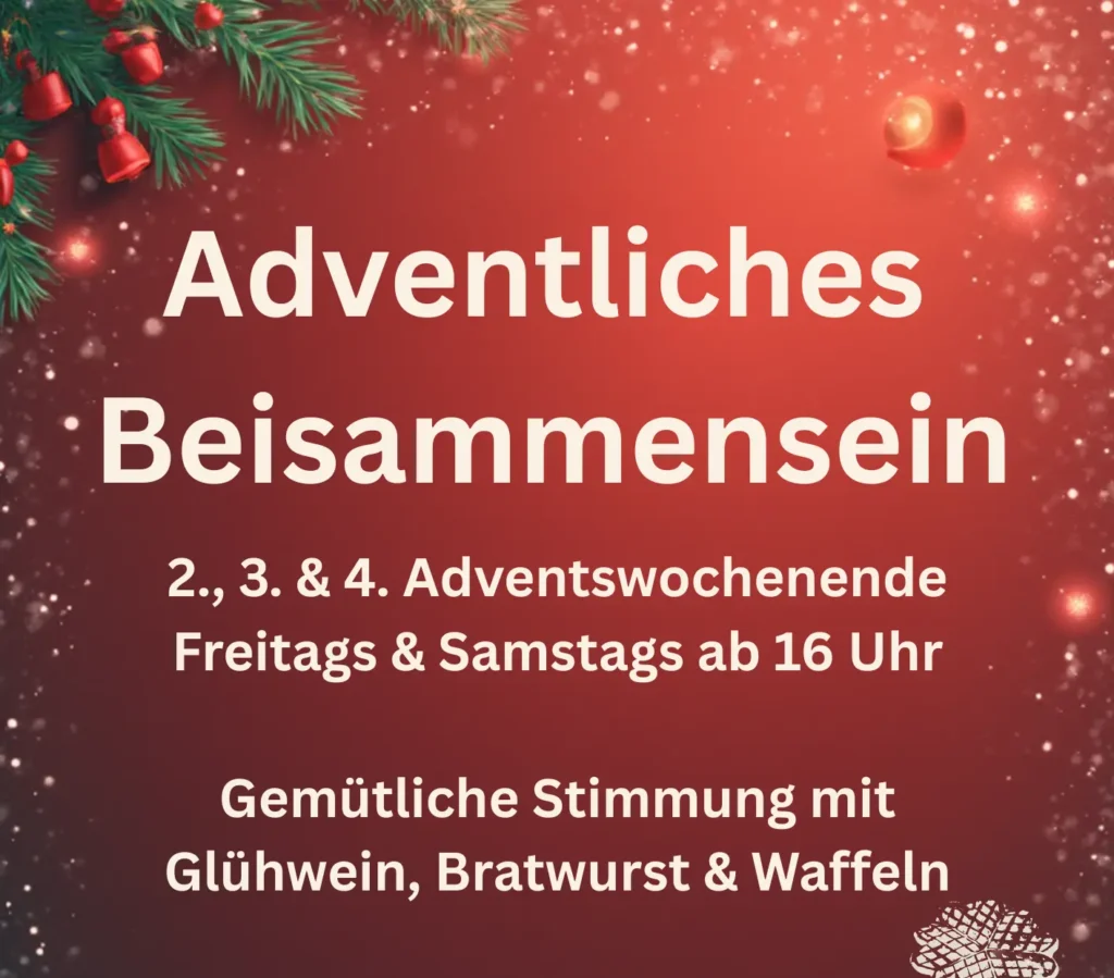 Genießt die Weihnachtszeit mit Bratwurst, Glühwein und Waffeln! Kommt am 2., 3. und 4. Adventswochenende je Freitags und Samstags ab 16:00 Uhr vorbei.